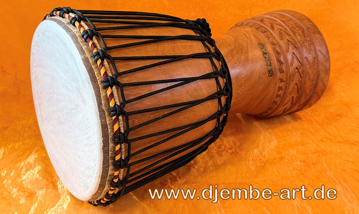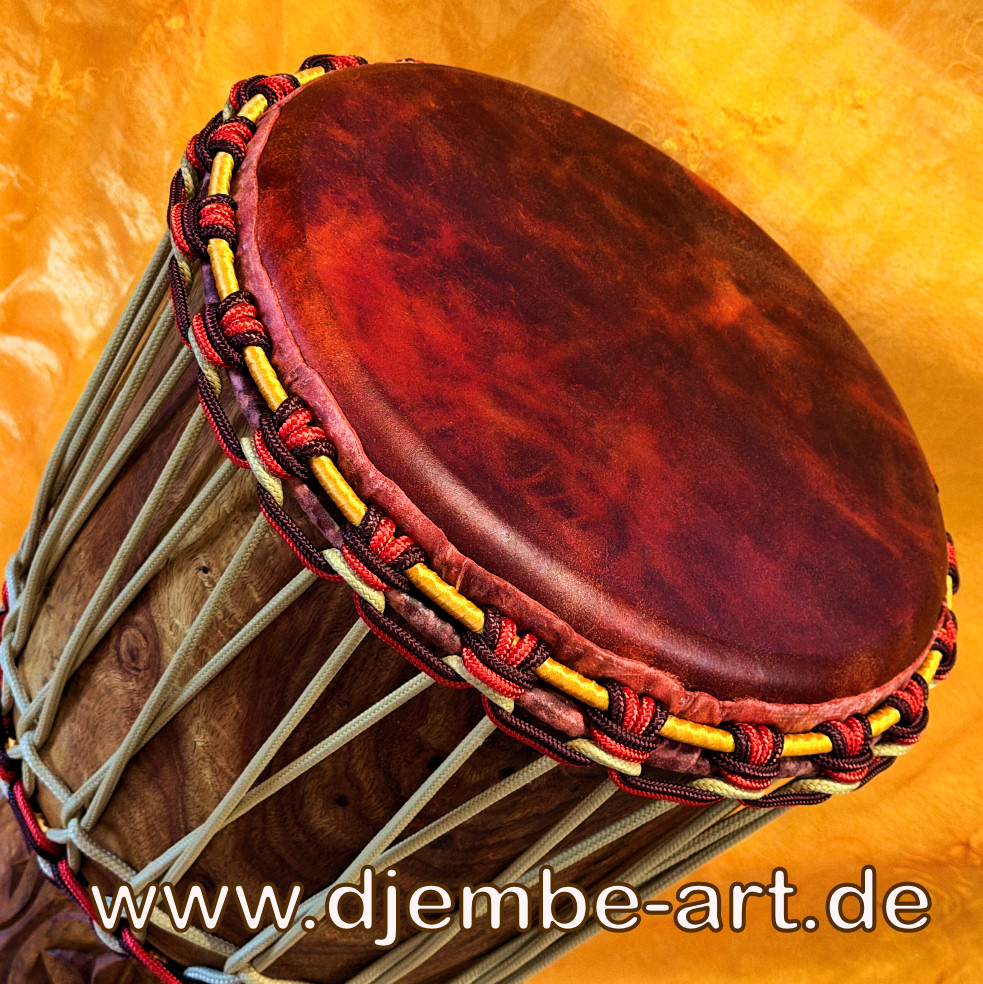 Feine Handwerkskunst von höchster Qualität. Ebenmäßig geschnitzt, sehr glatt geschliffen, poliert und mit Pflanzenöl geschützt. Der untere Spannring sitzt passgenau in einer eigens dafür geschnitzten Führungsrille. Djembé Art Premium Tau, sechzehnfach geflochten, 5 mm Ø, Rot. Premium Kalbshaut 1mm stark mit Batik Design.