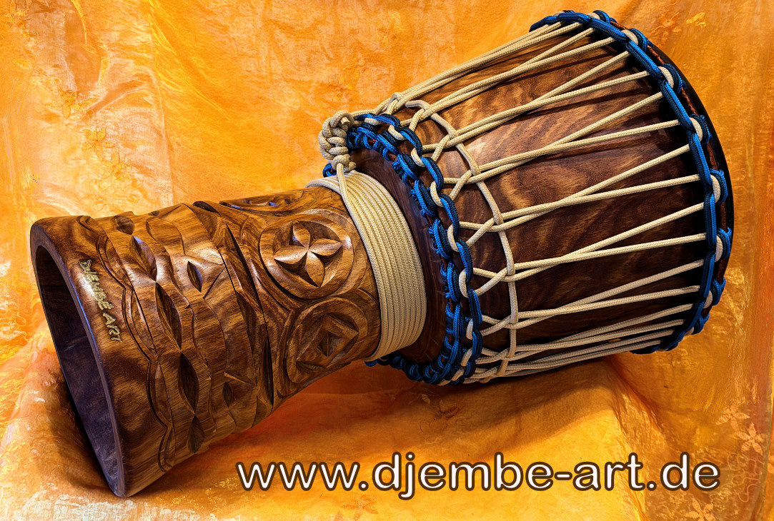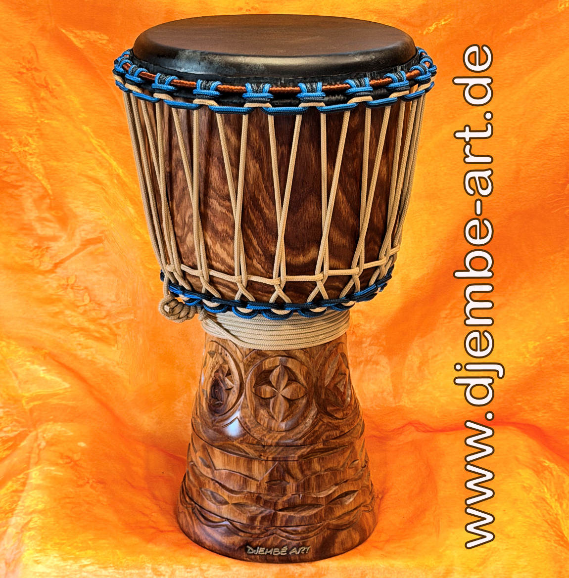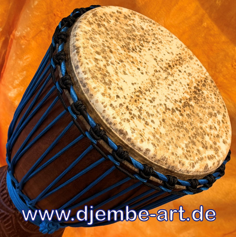 Feine Handwerkskunst von höchster Qualität. Ebenmäßig geschnitzt, sehr glatt geschliffen, poliert und mit Pflanzenöl geschützt. Vorgerecktes Qualitätstau, sechzehnfach geflochten, 5 mm Ø in Blau-Schwarz. Mit einer Mali-Masterdrumer Ziegenhaut bespannt.